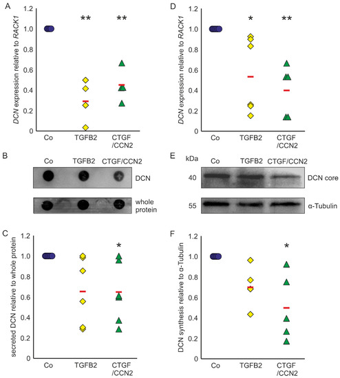 TGF-β and CTGF/CCN2 negatively regulate DCN in murine ON astrocytes (left) and human ONH astrocytes (right). (A) Treatment with TGF-β2 reduced DCN mRNA to 0.29 ± 0.22 (n = 4, p = 0.0003) and treatment with CTGF/CCN2 reduced DCN expression to 0.45 ± 0.16 (n = 4, p = 0.0019) in murine ON astrocytes. mRNA expression was normalized to RACK1. Expression in untreated controls was set to 1. (A) In the medium of murine ON astrocytes secreted DCN levels were at 0.66 ± 0.31 (n = 6, p = 0.089) after treatment with TGF-β2, while CTGF/CCN2 treatment significantly reduced DCN synthesis to 0.65 ± 0.26 (n = 6, p = 0.048). Secreted protein was normalized to whole protein, untreated controls were set to 1; (B,C). In human ONH astrocytes treatment with TGF-β2 reduced DCN mRNA to 0.56 ± 0.37 (n = 6, p = 0.0230) and treatment with CTGF/CCN2 reduced DCN expression to 0.40 ± 0.24 (n = 5, p = 0.0072). mRNA expression was normalized to RACK1. Expression in untreated controls was set to 1; (D) DCN protein levels were at 0.71 ± 0.11 (n = 4, p = 0.1861) after treatment with TGF-β2 (0.004 nM), while CTGF/CCN2 (3 nM) treatment significantly reduced DCN synthesis to 0.50 ± 0.18 (n = 5, p = 0.0129) in human ONH astrocytes (protein synthesis was normalized to α-Tubulin, expression in untreated control cells was set to 1); (E,F). Co = Control. *, ** are significant with p ≤ 0.05 or p ≤ 0.01.