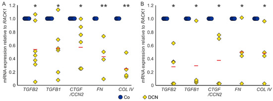 Conversely, treatment with DCN led to a significant downregulation of TGF-β2 (0.54 ± 0.34, n = 7, p = 0.006), TGF-β1 (0.56 ± 0.38, n = 6, p = 0.026) and CTGF/CCN2 (0.59 ± 0.30, n = 7, p = 0.005) in murine ON astrocytes compared to untreated controls. Furthermore, DCN treatment significantly lowered the mRNA expression of the ECM components FN (0.43 ± 0.21, n = 4, p = 0.005) and COL IV (0.25 ± 0.13, n = 4, p = 0.0001), which are target genes of TGF-βs and CTGF/CCN2 (Figure 4A). In coherence, treatment with DCN reduced expression of all five genes in human ONH astrocytes (TGF-β2: 0.27 ± 0.24, n = 5, p = 0.015; TGF-β1: 0.29 ± 0.40, n = 4, p = 0.02; CTGF/CCN2: 0.37 ± 0.36, n = 4, p = 0.011; FN: 0.49 ± 0.25, n = 4, p = 0.049; COL IV: 0.47 ± 0.17, n = 4, p = 0.032, Figure 4B).