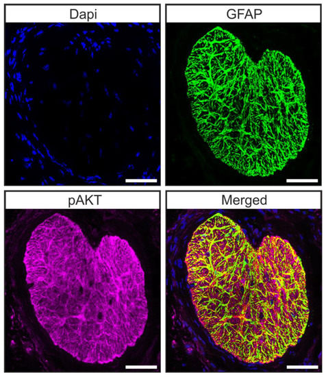 Microarray analysis of the transcriptome of brain astrocytes showed that the pAKT/AKT signaling pathway is active in these cells [44]. Hence, we carried out double staining against pAKT and glial fibrillary acidic protein (GFAP) in tangential sections of the glial lamina of 12-week-old animals to investigate whether astrocytes of the murine glial lamina engage in pAKT/AKT signaling. We found a co-localization of pAKT and GFAP in glial lamina (Figure 5) [45], showing that pAKT/AKT signaling is active in astrocytes of this region.