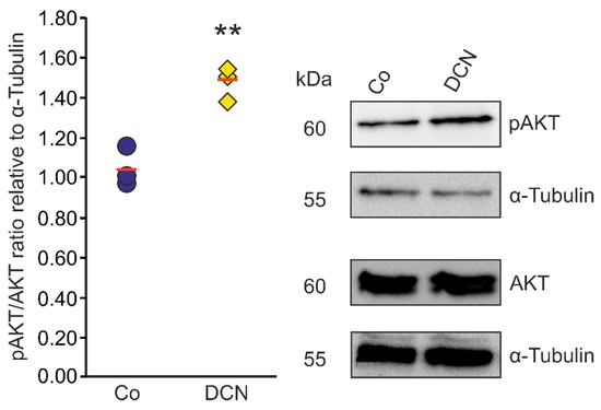 Since there is evidence in other cell types that DCN negatively regulates TGF-β via the pAKT/AKT signaling pathway [46] we aimed to analyze if the regulation of TGF-β and CTGF/CCN2 by DCN in murine ON astrocytes is also mediated via this pathway. Accordingly, we treated murine ON astrocytes with 25 nM DCN for 6 h to analyze its possible ability to activate the pAKT/AKT signaling pathway. We found an increase of pAKT in relation to AKT (Figure 6). The pAKT/AKT ratio of treated cells was 1.47 ± 0.09 (n = 3, p = 0.004) compared to untreated control cells (1.04 ± 0.09, n = 3); thus, we conclude that DCN treatment leads to an activation of the pAKT/AKT pathway in murine ON astrocytes.