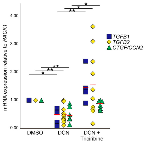 To analyze if the negative effects of DCN on expression of TGF-β1, 2 and CTGF/CCN2 are mediated via pAKT/AKT signaling, murine astrocytes were treated with the AKT signaling inhibitor triciribine in combination with DCN. Treatment with DCN resulted in a significant downregulation of all three growth factors (Figure 7; TGF-β2: 0.48 ± 0.09, n = 10, p = 0.001; TGF-β1: 0.44 ± 0.10, n = 6, p = 0.03; CTGF/CCN2: 0.49 ± 0.12, n = 6, p = 0.0006). After combined treatment with triciribine and DCN, triciribine attenuated effects of DCN on CTGF/CCN2, TGF-β1, and TGF-β2 mRNA expression (Figure 7; TGF-β2: 1.56 ± 0.36, n = 10, p = 0.031; TGF-β1: 1.46 ± 0.24, n = 5, p = 0.0004; CTGF/CCN2: 0.84 ± 0.06, n = 6, p = 0.013), whereas combined treatment with triciribine and DCN did not lead to changes in expression compared to untreated controls (pTGF-β1 = 0.85; pTGF-β2 = 0.32; pCTGF = 0.29).