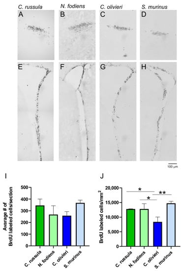 Localization and quantification of BrdU-labeled cells in the SVZ and RMS of the four studied shrew species. (A–D) Localization of BrdU-labeled cells in the RMS at the level of the SVZ. (E–H) Localization of BrdU-labeled cells in the SVZ. (I) The average number of BrdU immunopositive cells per section in the SVZ. (J) The numbers of BrdU immunopositive cells/mm2 in the RMS. * p < 0.05; ** p < 0.01; SVZ, subventricular zone of the lateral ventricle; RMS, rostral migratory stream.