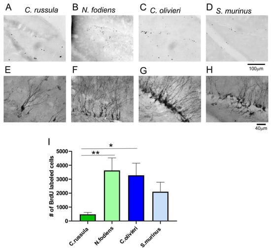 In the second neurogenic structure, 2 days after BrdU administration, labeled cells were visible in the subgranular layer of the DG, which is a place for proliferation of progenitor cells (Figure 4A–D). The visualized nuclei were small, round or slightly elongated. In the DG of C. russula, the number of BrdU-labeled cells was the lowest, and accordingly, the mean total number of BrdU-labeled cells in the DG was 480 vs. 3276 in C. olivieri. We defined that in the groups with shorter survival times after BrdU injection, more BrdU-labeled cells were identified than in animals that were perfused 14 days after BrdU injections (Figure 4I). A one way ANOVA showed that there was a significant difference in the main effect between species (F(3,16) = 3.93, p = 0.028). The smallest population of BrdU-labeled cells in the DG was present in C. russula (Figure 4I). DCX labeled cells were also sparse in the DG of C. russula (Figure 4E–H).