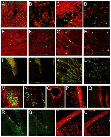 To examine the further fate of cells incorporating BrdU, we used a double fluorescent technique, immunostaining BrdU-labeled cells with NeuN, a neuronal marker, DCX, which is a marker of neuronal progenitors and very young neurons, or GFAP, a marker for astrocytes. In animals perfused 14 days after BrdU injections, approximately 95% of granule cells in the OB were double-labeled with NeuN and BrdU (Figure 5A,B), whereas in the RMS at the level of the OB, no BrdU-positive cells colocalized with NeuN (Figure 5C,D). In the RMS at both levels of OB (Figure 5E–H) and SVZ (Figure 5I,J), 80–85% of BrdU-labeled cells had colocalization with DCX. In animals 2 days after BrdU injections, colocalization between BrdU and DCX was also observed in cells that reached the OB (Figure 5K,L). Additionally, in the RMS, we found no colocalization between BrdU and GFAP (Figure 5M,N), while BrdU-labeled cells located in the SVZ colocalized with GFAP (Figure 5O–Q). Approximately 40% of BrdU-positive cells colocalized with DCX (Figure 5R,S) or NeuN in the DG (Figure 5T,U). In the DG of animals that survived 2 days after BrdU treatment, a large number (95%) of DCX-labeled cells were localized in the granular layer, while most of BrdU immunopositive cells were placed in the subgranular layer.