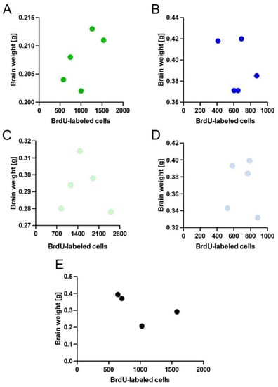 To calculate the association between the number of BrdU-positive cells and brain mass, we analyzed a linear dependence between these two variables. The density of BrdU-incorporated cells in the OB or DG was not correlated with the size of the brain within species of shrews. Pearson correlation analyses established that there was no significant relationship (p = 0.44) between the number of BrdU-positive cells and brain mass within a selected shrew species (Figure 6A–D). Furthermore, we found no correlation between the number of BrdU-labeled cells and brain mass in investigated species of shrews (Figure 6E).