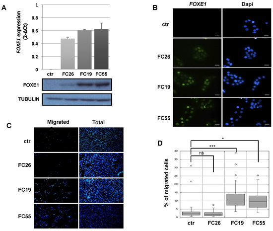 FOXE1 elicits thyroid cell migration of FOXE1-overexpressing clones. (A) FOXE1 expression in ctr cells and different FOXE1 clones (FC) analysed by qRT PCR (upper panel) and Western blot (bottom panel). Tubulin was used to normalise. (B) Immunofluorescence images of the same clones as in A, probed with anti-FOXE1 antibody, showing nuclear FOXE1 localisation. Nuclei are stained with Dapi. 40× magnifications are shown. The scale bar represents 20 um. (C) Transwell assay performed on control cells (ctr) and FOXE1-expressing clones FC26, FC19, FC55. Representative images of the transwell used before (total) and after (migrated) swab cleaning of the inner part of the upper chamber. Cells were stained with Dapi in order to visualise the nuclei. (D) The percentage of migrated on total cells was calculated. One-way ANOVA test was performed on data, and p-values are reported for each clone relative to ctr. * p < 0.05, *** p < 0.001, ns: not significant.