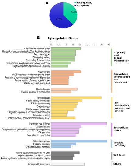Functional annotation of differentially expressed genes in FOXE1-overxpressing cells. RNAseq analysis was performed on total RNA from FC55 and control cells. (A) Pie chart of differentially expressed genes (DEG), considered with a ±2-fold change (FC) and p ≤ 0.05 cut-off and analysed by Gene Ontology (GO). A total of 750 DEG resulted as being regulated, of which 469 (62.5%) upregulated and 281 (37.5%) downregulated. Functional categories were significantly enriched among genes that were either (B) upregulated or (C) downregulated. Functional categories (highlighted on the right in vertical groups) were obtained by clustering the functional annotation contained in the web-based DAVID database. To perform clustering, we used multiple annotations—namely, gene ontology for biological processes, molecular function and cellular components (GO_DIRECT), pathways, protein interactions, protein domain and tissue expressions. Enrichment scores are plotted only for clusters containing multiple terms with p < 0.05.