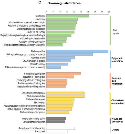 To investigate the transcriptional programme induced by FOXE1 in thyroid epithelial cells, we selected the FC55 displaying the highest and most homogeneous expression of FOXE1. RNAseq analysis was performed on total RNA from FC55 and control cells. Differentially expressed genes (DEG) were considered with a ±2-fold change and p ≤ 0.05 cut-off and analysed by Gene Ontology (GO). A total of 750 DEG resulted as being regulated ± 2-folds, of which 469 (62.5%) were upregulated and 281 (37.5%) were downregulated (Figure 2A). GO terms enriched in upregulated genes were clustered in functional categories mainly related to signal transduction, macrophage recruitment and differentiation, metal ion homeostasis and transport and extracellular matrix components (Figure 2B). GO terms significantly enriched in downregulated genes were instead mainly related to cell cycle, epigenetic regulation of chromatin, immune cell migration and cholesterol metabolism (Figure 2C). A panel of DEG, grouped for functional categories, was then validated performing quantitative RT-PCR on the three clones FC26, FC19 and FC55 (Figure S1).