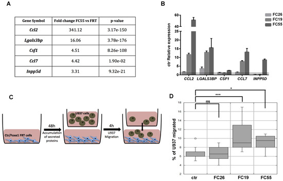 The observed enrichment of multiple functional categories related to immune cells recruitment, migration and differentiation in FOXE1-induced DEG was largely unexpected. Particularly, several genes involved in macrophages chemotaxis and differentiation were clustered in the upregulated genes list. Among these, the most strongly upregulated was CCL2, a well-established macrophage chemoattractant. In addition, several other genes encoding secreted proteins involved in macrophage recruitment and activation, such as CCL7, CSF1, LGALS3BP and INPP5D [24,25,26], resulted as being upregulated in FC55 by RNA-seq (Figure 3A). Upregulation of these macrophage ligands was validated by quantitative RT-PCR in the FC, revealing a correlation between FOXE1 dosage and the extent of these genes’ upregulation (Figure 3B). To investigate if the induction of these genes could change macrophage recruitment by chemoattractants release in the extracellular medium, we tested the ability of FC to induce monocyte chemotaxis by co-culture assay. FRT and the three FOXE1 clones were cultured in the transwell lower chamber in order to obtain secreted proteins accumulation in the medium. U937 human monocytes were then added in the upper chamber in serum-free medium, and their migration through the transwell porous membrane was measured (Figure 3C). A statistically significant increase of U937 cells migration was observed only when co-cultured with the high FOXE1 expressing clones FC19 and FC55 (Figure 3D), demonstrating a FOXE1 dose-dependent gain in chemoattractant activity.
