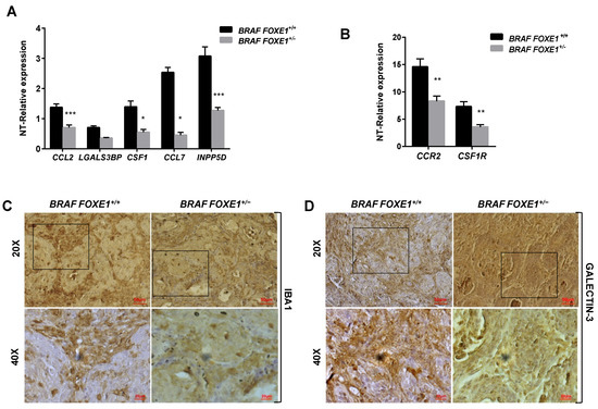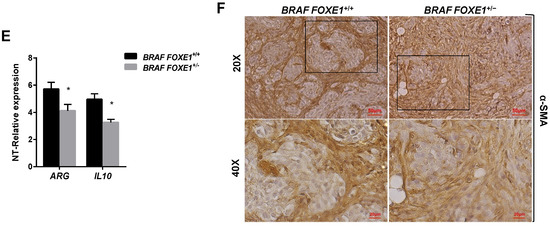 It has been demonstrated that conditional activation of oncogenic BRAF in mouse results in the induction of thyroid cancers with increased CCL2 and CSF1 expression, associated with the recruitment of tumour-associated macrophages (TAMs) [12]. Given that FOXE1 expression induces both CCL2 and CSF1, together with other chemoattractants, in thyroid cells in vitro, we asked if FOXE1 could modulate the oncogenic induction of chemokines and hence the infiltration of thyroid cancer by TAMs in vivo. To answer this question, we used a FOXE1+/+ and FOXE1+/- BRAFV600E-dependent thyroid cancer mouse model (BRAF) to induce thyroid cancer in the presence of reduced FOXE1 expression [20]. Mice were treated with doxycycline for one week to develop thyroid cancer [19], and the expression levels of CCL2, CSF-1, LGALS3BP, INPP5D and CCL7, together with that of the chemokine receptors CCR2 and CSF1R, were measured in cancer specimens by quantitative RT-PCR. Tumours developed in BRAF FOXE1+/- background showed significantly reduced expression of all the genes investigated compared with those developed in BRAF FOXE1+/+ mice (Figure 4A,B). In this cancer model, it is known that BRAFV600E activation induces a robust recruitment of M2-polarised TAMs [12]. Tumour infiltration by TAMs was then evaluated on thyroid cancer sections by immunohistochemistry (IHC) for the macrophage markers IBA1 and for GALECTIN-3, this latter being described to regulate alternative macrophage activation towards an M2 pro-tumourigenic state [27,28,29]. As shown in Figure 4C,D, both markers show reduced staining in the BRAF FOXE1+/- cancer samples with respect to the BRAF FOXE1+/+ ones. The expression of two additional M2-related markers, ARGINASE1 (ARG) and INTERLEUKINE10 (IL10) [30,31], was measured to further evaluate if the reduction of FOXE1 levels could affect the abundance of this macrophage subpopulation within the tumour. BRAF FOXE1+/- cancers showed a weaker expression of both M2 markers with respect to the BRAF FOXE1+/+ ones (Figure 4E). Since cancer-associated fibroblasts (CAFs), together with TAMs, are the main components of the tumour stroma, we looked at α-SMA expression as a CAFs-specific marker. IHC for α-SMA reveals that reducing FOXE1 levels in BRAFV600E-induced thyroid cancer decreases the CAFs stromal expansion observed in FOXE1 wild type background (Figure 4F). As control, we analysed WT and FOXE1+/- mice, that do not develop cancer because they are not transgenic for BRAFV600E [20], observing no statistically significant differences in the expression of chemokines and their receptors (Figure S2A) or in IHC staining for IBA1 (Figure S2B,C).