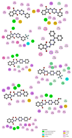 A molecular docking study showed that G is the compound with the lowest free binding energy. As can be observed, it occupies a close area, similar to that observed for meloxicam, where the following structural correspondences occur: thiazine ring with arylpiperazine fragment, carboxamide with (CH2)–(C=O), and thiazole with phthalimide fragment. For COX-2, compound H interacts with Arg120 and Tyr355 via hydrogen bond with carbonyl group from (CH2)–(C=O) moiety (distance 2.3 Å, 2.5 Å). The isoindol-1,3(2H)-dione part of the compound is involved in interaction with Leu352, Ala523 (π-σ), and Val523 (π-alkyl). The piperazine ring interacts with Val349, Leu359 (alkyl), phenyl group via π-alkyl interactions with Leu531, π-σ with Ile345, π-sulfur with Met535, and methoxy group with Leu534 (Figure 2). These interactions are very similar to compound H, the most active in biological evaluation. Compared to meloxicam, compound G (or H) interacts directly with Arg120 and Tyr355, meloxicam (or other oxicams) do not directly interact by hydrogen bonding. It interacts indirectly by bridging with two tightly bound water molecules: a tetrahedrally coordinated water bound to Arg-120 and Tyr-355 [43]. A hydrogen bond between the 4-hydroxyl group of meloxicam and Ser 530 is reported [43]. It seems to be similar to hydrogen bonding between the carbonyl group and Ser353 observed into the binding pocket of isomer COX-1. The subpocket with Leu531 and Ile345 plays an important role in the interaction of meloxicam with COX-2 [43]. Contacts with thiazine moiety stabilize the complex. As seen in Figure 2, compound G interacts with Leu531 and Ile345 by benzene ring. The worst derivative, with the highest energy, is compound C. The linker without a carbonyl group removes interaction with Arg120 and Tyr355 (hydrogen binding). CF3 group in phenyl (instead OCH3) removes interaction with Leu531 and Ile345.