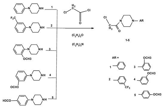 1-Phenyl-4-piperazine (1) (1.62 g, 0.01 mol)/ 1-(3-trifluoromethyl)piperazine (2) (2.3 g; 0.01 mol)/1-(2,3 or 4–methoxyphenyl)piperazine (3, 4, 5)(1.62g, 0,01 mol) and triethylamine (1.4 g; 0.013 mol) were dissolved in 100 mL of diethyl ether. Chloroacetyl chloride (1.13 g, 0.01 mol) in 35 mL of diethyl ether was added slowly over the course of 1 h. The mixture was allowed to stir at room temperature for 30 min; after this time the solvent was evaporated completely under reduced pressure, and the residue was dissolved in 120 mL of CHCl3 and 20 mL of water. The organic layer was separated, dried (Na2SO4), filtered gravitationally using a corrugated filter paper and concentrated. The residue was crystallized from ethanol (1,3,4,5). The oil residue (2) was purified by a chromatography column (silica gel mesh 70–230, ethyl acetate, Rf = 0.79, monitoring by TLC). The structure of intermediates 1–5 obtained was confirmed by elemental analysis (C, H, N) and 1H NMR spectral, MS-MS.