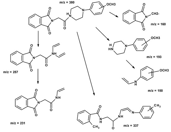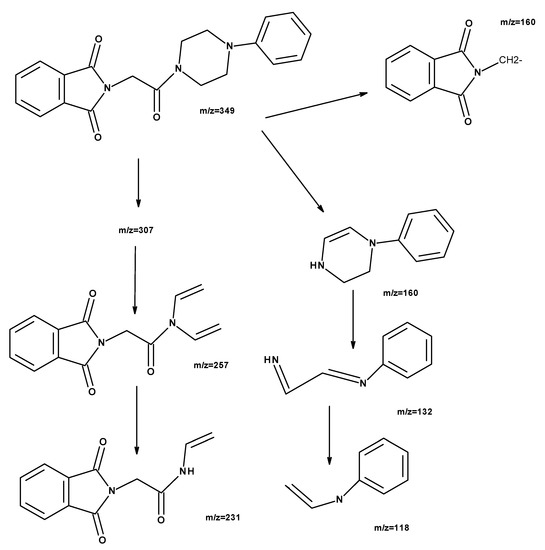 The final compounds had a sharp melting point (m.p.), correct elemental analyses (C, H, N), IR and 1H NMR spectra and mass values determined by MS–MS. In some cases (EI), the daughter ions formed during the fragmentation of the final compound have been identified by electrospray ionization–mass spectrometry (ESI–MS). The structures of degradation products and the mechanics of their formation were designed in accordance with the information on the mass of quasi-molecular ions and fragmented degradation products using the DataAnalysis Program [29]. The structure of the degradation products and the mechanisms of their formation were deduced based on information on the mass of quasi-molecular ions and fragmented degradation products based on previous information and literature reports [27,30]. The chromatogram of the sample solution and the proposed EI imide degradation pathways are shown in Scheme 4, Scheme 5 and Scheme 6 and in additional materials: I (E), II (F), III (G), IV (H), and V (I). The characteristics of EI degradation products are included in Tables S1–S5 in Supplementary Materials.
