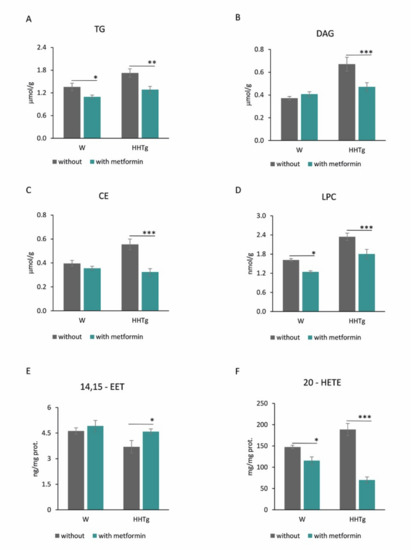 Effects of metformin on myocardial lipids, lipotoxic intermediates (A) triglycerides, (B) diacylglycerols, (C) cholesteryl esters, (D) lysophosphatidylcholine) and CYP-derived arachidonic acid metabolites (E) 14,15-epoxyeicosatrienoic acid, (F) 20-hydroxyeicosatetraenoic acid) in Wistar control (W) and hereditary hypertriglyceridemic (HHTg) rats. Data are mean ± SEM; n = 8 for each group. Significance was determined using two-way ANOVA and Fisher’s LSD post-hoc test (* denotes p < 0.05; ** denotes p < 0.01; *** denotes p < 0.001).