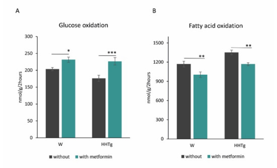 Effects of metformin on glucose (A) and palmitate oxidation (B) in the myocardium in Wistar control (W) and hereditary hypertriglyceridemic (HHTg) rats. Data are mean ± SEM; n = 8 for each group. Significance was determined using two-way ANOVA and Fisher’s LSD post-hoc test (* denotes p < 0.05; ** denotes p < 0.01; *** denotes p < 0.001).
