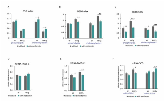 Effects of metformin on relative mRNA expression (D–F) and activity (desaturation index) (A–C) of the desaturases SCD-1, FADS-1 and FADS-2 in myocardium of Wistar control (W) and hereditary hypertriglyceridemic (HHTg) rats. Data are mean ± SEM; n = 8 for each group. Significance was determined using two-way ANOVA and Fisher’s LSD post-hoc test (* denotes p < 0.05; ** denotes p < 0.01; *** denotes p < 0.001).