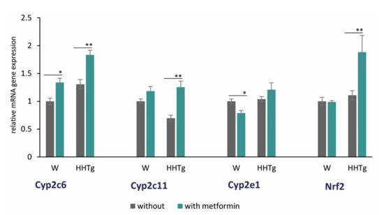 Effects of metformin on relative mRNA expression of some CYP450 family proteins expressed in myocardium and nuclear factor Nrf2 in Wistar control (W) and hereditary hypertriglyceridemic (HHTg) rats. Data are mean ± SEM; n = 8 for each group. Significance was determined using two-way ANOVA and Fisher’s LSD post-hoc test (* denotes p < 0.05; ** denotes p < 0.01).