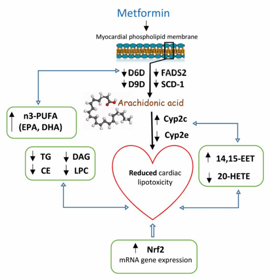 Putative involvement of metformin in cardiac arachidonic metabolism, CYP-derived arachidonic acid metabolites and some cytochrome P450 proteins. The alterations in AA metabolism is manifested in the form of elevated production of anti-inflammatory 14,15-EET, produced by Cyp2c and inhibited formation of pro-inflammatory 20-HETE, produced by Cyp2e. In addition, reduced SCD-1 expression with an inhibited D9D activity index in the myocardium contributes to reduced myocardial accumulation of neutral lipids and toxic lipid intermediates, respectively. Affecting the desaturation system is associated with an altered fatty acid profile in membrane phospholipids in the myocardium, which contributes to an increased proportion of n3-PUFA, resulting in increased membrane fluidity. All these changes, together with markedly elevated Nrf2 expression, contribute to the reduction of cardiac lipotoxicity and inflammation.