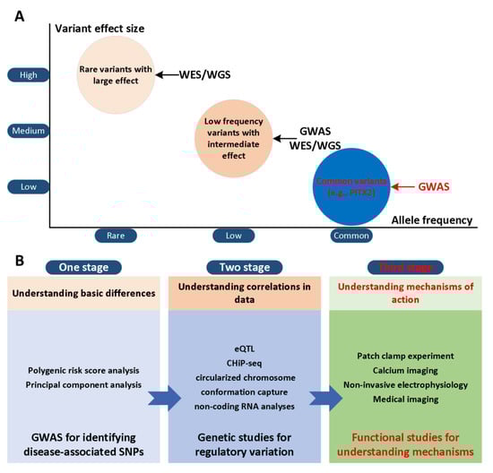Role of genes in AF from GWAS locus to gene and mechanism. (A) GWAS for atrial fibrillation have explored common variants and established many associations with modest to low effect size on disease risk. Whole-exome and -genome sequencing studies seek to further identify low-frequency and rare variants within genes or across the entire genome, respectively. (B) The workflow for bridging the genotype-phenotype relationship involves a hierarchical staging of analysis methods: (1) basic gene differences between controls and cases; (2) relevant patterns and correlations in the data []; (3) mechanisms of atrial fibrillation in the context of impaired PITX2 that can explain apparent gene differences.