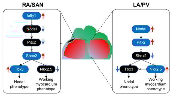 Schematic illustration of PITX2 signaling in atria. Lefty1 represses PITX2 expression in the right atrium (RA), resulting in upregulation of Shox2 that induces sinoatrial nodal (SAN) gene expression through Tbx3. In the left atrium (LA) and pulmonary vein (PV) myocardium, PITX2 is upregulated, leading to downregulation of Shox2 and upregulation of Nkx2.5, which mediates the working myocardium gene expression [].