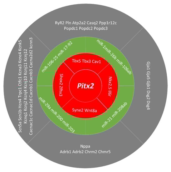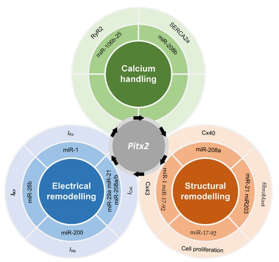It is known that PITX2 plays a key role in establishing left-right asymmetry and in heart development. Therefore, it supports the notion that impaired function of PITX2 might underlie AF. In the following sections, we will introduce the role of PITX2 in left-right asymmetry, summarize the regulation effects of PITX2 on gene networking, microRNAs and membrane effector gene and discuss remodelling arising from impaired PITX2 in AF [].