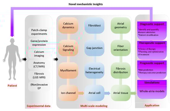 Based on multiple experimental data (such as CT, MRI, LGE-MRI, electrocardiography, genetics, proteins and membrane potential measurements) obtained from patients, multi-scale mechanistic models are developed by using systems of differential equations []. For example, models of ion channels across the cell membrane, the intracellular calcium kinetic model, the regulation model of calcium signal, myofilament mechanics model and microstructure model are the important parts of the cell model. Considering cell models, gap junction model and fibroblast-myocyte coupling are integrated into the tissue structure to form a basic tissue model. Base on the basic tissue model, atrial geometry, fiber orientation and fibrosis distribution are used to establish a whole-atria model. Using multi-scale atrial models, the simulation of PITX2-induced remodelling can perfectly control parameters and observe all model components, making it very suitable for testing causality and exploring AF mechanisms []. In detail, novel mechanistic insights from multi-scale atrium models would provide prognostic support, therapeutic support and diagnostic support (Figure 5). In the following sections, we will introduce recent advances in models of ion channel, calcium handling, atrial cell and atrial geometry.