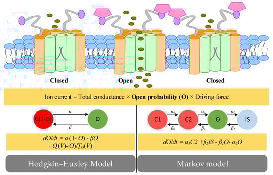 Ion channels, specialized proteins in the plasma membrane, provide a passageway through which ions can move downward along the electrochemical gradient of the plasma membrane. The movement of ions can generate an ion current which is determined by the driving force, dynamic opening probability of ion channels and the maximum conductance []. Ion-channel open probability can be modelling with three common approaches (i.e., instantaneous and time-independent functions, Hodgkin–Huxley representations and Markov formulations) for two types ion channels. For ionic currents such as IK1, the open probability is usually represented as an instantaneous state variable [,]. For other currents such as the sodium current with several gating variables operating independently or with a number of dependent states, their open probabilities can be represented as Hodgkin–Huxley functions, or Markov models [] (Figure 6). In Hodgkin–Huxley representations, each kinetic characteristic is represented with a gating variable, which dynamically changes according to “open” and “close” rates, which depend on driving forces (e.g., membrane potential) []. All kinetic properties in the process independently operate and thereby the open probability is calculated by multiplying the individual gating variable. In Markov formulations, the movement of charged ions through membrane channels is represented by a number of dependent states (e.g., closed type 1 (C1), closed type 2 (C2), open (O) and inactivated (IS)). Each dependent state variable reflects the fraction of ion channels currently residing and state transition rates can be depended on any state variable. It is worth noting that each Hodgkin–Huxley model has a Markov equivalent, but the converse is not the case because Markov models are not limited to the same assumptions (identical and independent gating particles). Within ion channel modelling, the kinetic parameters need to be estimated. For any two-gate Hodgkin–Huxley model, there are four ways to fit a voltage-dependent ion-channel model to whole-cell current experiments []. The first method is to use the voltage clamp protocol to measure the ion current and analyze it to obtain the time constant and steady state of multiple voltages. Curves are fitted to the obtained points and the estimated parameters are inserted into the ion channel model. Different from the first way, the second way conducts simulations to obtain simulated steady states and time constants. The difference between the experimental and simulated data points is calculated and minimized to determine the estimated parameters using numerical optimization. Like the second way, the third way considers the differences between the experimental and simulated data points, but these data points are from the current traces instead of the summary curves. Like the third method, the fourth method uses a single compressed voltage clamp protocol instead of a series of classic protocols to take advantage of the difference between experimental and simulated current traces. The advantage of the first and second methods is that only steady-state and time constants are required as inputs, which are easy to find in the experimental literature.