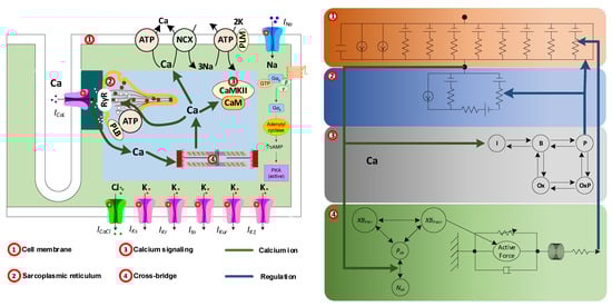 The ions flowing through the ion channels in the plasma membrane generate currents, and these currents cause a characteristic change in the membrane voltage, called the action potential. This action potential triggers the release of calcium from the internal stores (i.e., the sarcoplasmic reticulum) through a process called calcium-induced calcium release, which results in an instantaneous increase in the internal calcium concentration. These calcium ions interact with myofilaments to trigger cell contraction, but also impact diverse signaling cascades and influence the regulation of gene expression. In order to capture these changes of atrial cells, atrial cellular electrophysiology, calcium handling, calcium signaling and myofilament contraction should be considered in the atrial cell models (Figure 7). Computational modelling of components (including cellular electrophysiology [,,], calcium handling [], calcium signaling [,] and myofilament contraction []) has been previously reviewed. Here, we mainly summarize the existing human atrial cell models.