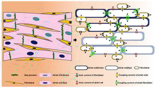 Atrial muscle is a composite tissue at the microscopic level. The tissue is composed of atrial cardiomyocytes and fibroblasts supported by extracellular matrix and infiltrated by liquid []. Atrial cardiomyocytes are coupled to other cardiomyocytes or/and fibroblasts through gap junctions, so that both cell-to-cell signal transduction and action potential propagation can be achieved (Figure 8). Propagation of the action potential in the atrial tissue is usually modeled using spatially continuous models that are seen as a local spatial homogenization of the behavior of membrane, intra- and extracellular spaces. The current in the tissue structure is usually controlled by using a conductivity tensor field through a single domain reaction-diffusion partial differential equation to the volume of the tissue or organ. Atrial tissue micro-structure (including spatial organization and cellular components of myocardium) and electrical properties have been reviewed extensively elsewhere []. In this section we focus on geometric and image-based atrial modeling.