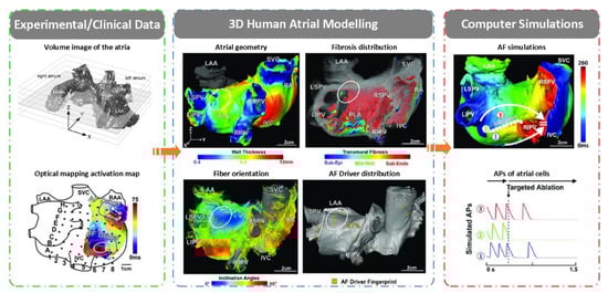 In order to study human AF mechanisms and treatment, a lot of effort has been invested to integrate detailed anatomical, structural and electrophysiological information in the three-dimensional (3D) computer atrial modeling [,]. Based on experimental/clinical data on medical imaging and invasively acquired electroanatomic maps, atrial geometry with wall thickness [], fibrosis distribution [,], myofibre orientation, regional electrical heterogeneities and AF driver distribution [] were used to develop patient-specific 3D models []. In details, models with real atrial geometry are reconstructed from medical imaging, specifically from cardiac MRI and/or cardiac CT scans using image segmentation and 3D reconstruction algorithms [,,,]. In the 3D atria, fibrosis can be detected on late gadolinium enhancement MRI (LGE-MRI) using different thresholding techniques [,]. In additional to fibrosis distribution, the orientation of muscle fibers, which has effect on the electrical conductivity, should be incorporated in 3D atrial models using fibre orientation atlases derived from histology, rule-based methods or methods that use morphological data of the endo- and epicardial surfaces and the local solutions of Laplace’s equations [,]. Besides these structural heterogeneities (wall thickness, fibrosis distribution and myofibre orientation) [], electrical heterogeneity also plays important roles in the genesis of AF [,,]. Electrical heterogeneities are mainly characterized by regional differences in action potential morphology and conduction velocity arising from regional variations of ion current and connexin expression [,,]. The regional differences in action potential morphology have typically been incorporated by changing the maximum conductance and gating variables of ion channel models, and differences in conduction velocity can be represented in models by spatially changing the conductivity of the tissue according to the tensor vector obtained from the fiber direction information []. The 3D virtual human atria not only allows to differentiate the relative contribution of each variable (i.e., gene variants, ion channels, calcium handling proteins or structural features) to AF mechanisms, but also allows for the development of personalized treatments (e.g., targeted ablation planning and antiarrhythmic drug selection) [] (Figure 9).