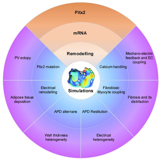 Atrial computational modelling allows integration of detailed basic information about atrial electrophysiology at the cellular and tissue level and relevant simulations provides insight in the fundamental mechanisms involved in initiation and perpetuation of PITX2-dependent AF. Increased triggered activity is the primary mechanism of PITX2-dependent AF initiation. Maintenance of PITX2-dependent AF is associated with remodelling (including electrical and structural remodelling) of the atria. Regions of structural or functional inhomogeneities arising from left–right asymmetry of Pitx2 expression may promote maintenance of re-entrant drivers. Experimental data on PITX2-dependent remodelling have been incorporated in atrial models to predict arrhythmic behaviour, linking the impaired PITX2 to AF with the altered electroanatomical substrate. Key structural and functional alternations that are mechanistically linked to PITX2-dependent AF and have been studied using computational models are calcium handling, PITX2 mutation, electrical remodelling, electrical heterogeneity, APD restitution and atrial wall thickness heterogeneity (Figure 10). Although pulmonary vein (PV) ectopy [], atrial adipose tissue infiltration, development of repolarisation alternans, presence of atrial fibrosis and its distribution, fibroblast-myocyte uncoupling, and atrial stretch with mechano-electrical feedback have a significant role in the maintenance of re-entrant drivers, current atrial modelling studies have not incorporated these alterations.