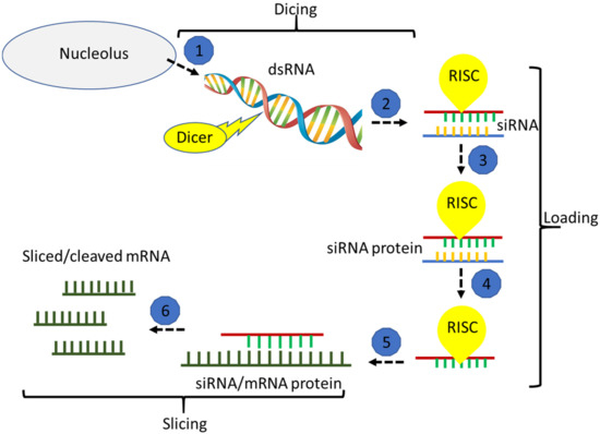 Figure 1. Illustration of the general RNAi pathway overview. Steps (1, 2) refer to dicing, (3, 4 and 5) refer to loading, (6) refer to slicing. (Adapted from [5,25]).