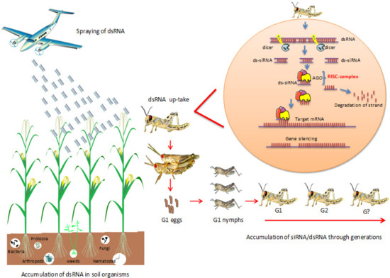 More studies are required to figure out the accumulation of dsRNA/siRNA through generations in different insect species and to expose these insects to different dsRNA sets during their life cycle. (Figure 2). Precautionary studies are needed to follow dsRNA/siRNA accumulation in predators such as ladybird beetles, spiders, and lacewings.