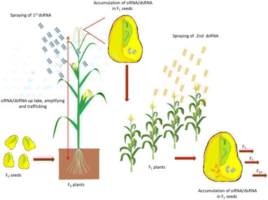 A microinjection study in pumpkin, Cucurbita maxima, provided direct evidence that phloem small RNA binding protein 1 (CmPSRP1) mediates the trafficking among cells of 25-nt single-stranded RNA (siRNA), but not dsRNA [46]. The systemic spread of the silencing signal to the adjacent leaves within 1 h and the presence of dsRNAs up to 9 days post-application have been documented [22]. The efficient spray-induced control of Fusarium graminearum in the distal tissue involved the transport of CYP3-dsRNA via the plant vascular system and processing into siRNAs by FgDCL-1 after uptake by the fungi [23]. sRNAs are a core component of a signaling network that mediates epigenetic modifications in plants [47]. Epigenetic regulation can be mediated through a dynamic interplay between sRNAs, DNA methylation, and histone modifications, modulating transcriptional silencing of DNA. Regulatory sRNAs are short (20–24 nt), non-coding RNAs produced through the RNAi pathway that involves the plant-specific DNA-dependent RNA polymerases Pol IV and Pol V [48,49]. Overall, these examples suggest that siRNA or dsRNA could accumulate in seeds, and that exposure to different dsRNA doses may lead to genomic modifications in seed and plant; long-term experiments are needed to investigate the persistence of siRNA or dsRNA in seeds for several generations (Figure 2 and Figure 3).
