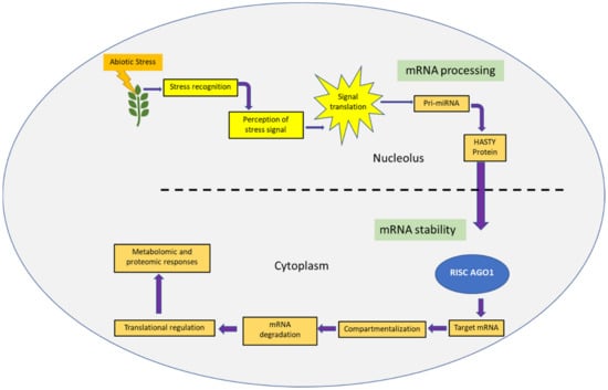 Figure 4. Pathway showing the steps involves in post transcriptional regulation mediated by abiotic stress-responsive miRNA genes in plants. Adapted from [4].