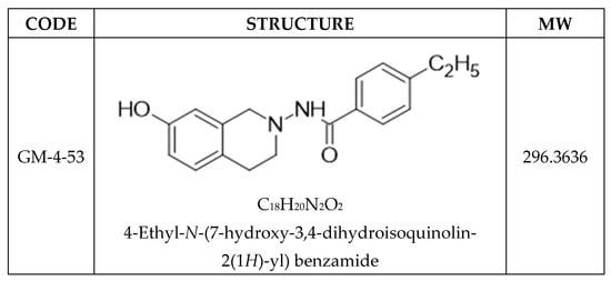 The synthesis and characterization of tetrahydroisoquinoline GM-4-53 have been described previously []. O-mesitylene sulfonyl hydroxylamine (MSH) was used to prepare the N-amino salt as an aminating agent, as previously reported []. MSH (22.74 mmol) was added, in dry methylene chloride (10 mL), an ice-cool solution of 7-hydroxyisoquinoline (20.67 mmol) in anhydrous methylene chloride and anhydrous methanol (1:1) (60 mL), over 5 min with stirring. The reaction was stirred at 0 °C for 6 h, as previously reported in the procedure. 4-ethyl benzoyl chloride (8.32 mmol) was added to an ice-cold solution of N-amino salt (4.16 mmol) in anhydrous tetrahydrofuran (40 mL) containing trimethylamine (2.0 mL). The mixture was allowed to proceed for 12 h at 70 °C to obtain N-ylide as a stable crystalline solid. Sodium borohydride (50.0 mmol) reduction of ylide in absolute ethanol (50 mL) furnished the 4-Ethyl-N-(7-hydroxy-3,4-dihydroisoquinolin-2(1H)-yl) benzamide (GM-4-53), with fair to good yield (65% yield).