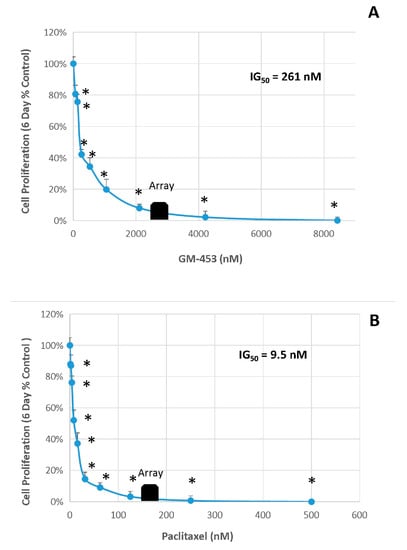 Cytostatic growth-inhibitory effects of GM-4-53 (A) and paclitaxel (B) in MDA-MB-231 cells were determined with an endpoint cell count analysis conducted on day 6. The data represent cell count/proliferation (as % untreated control) and are expressed as the Mean ± SEM, with the IG50s determined by regression analysis. Significant differences from the control were determined using a one-way ANOVA followed by a Tukey post hoc test. * p < 0.05. Array blocks denote the specific concentrations used for microarray analysis vs. controls.