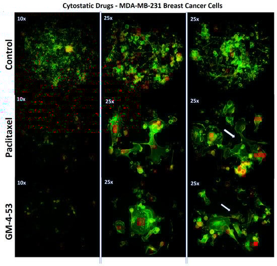 Morphological Changes associated with cytostatic growth-inhibitory effects by GM-4-53 5 μg/mL and paclitaxel 1 μg/mL in MDA-MB-231 cells evaluated at day 6. The images demonstrate cytostatic changes to the actin cytoskeletal architecture (green) with a propidium iodide nuclear counterstain (red) in the presence of either drug vs. untreated controls. [10×] shows the basic overview of accumulated cell number (cell proliferation), where [25×] shows higher magnification to enable visualization of deformed cell morphology n = 2. The images show abnormally large-shaped extended actin networks in cells that are unable to divide.
