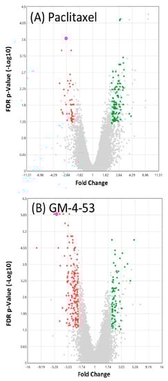 Summary of gene changes by fold change and significance in cytostatic cells vs. untreated controls from a total of 48,226 genes analyzed. (A) paclitaxel (1 μg/mL) vs. controls (B) GM 4-53 (5 μg/mL) in MDA-MB-231. The data show upregulated DEGs (right/green) and downregulated DEGs (left/red) by fold change relative to untreated controls (X-axis), with FDR p-values (Y-axis). Selected criteria for array analysis: Fold change >2 or <−2, p-value < 0.05, and false discovery rate (FDR) p-value < 0.05. Plotted points denoted in gray did not meet the selected criteria.