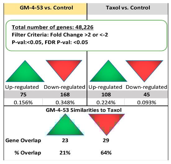 Gene Summary Report. Overall summary of DEGs reflected by whole-transcriptomic analysis in GM-4-53 (5 μg/mL)- or Paclitaxel (1 μg/mL)-treated cells vs. controls after 36 h of incubation in MDA-MB-231 cells; Criteria = FC > 2 or <−2, p-Value < 0.05 and FDR p-value < 0.05. Information on overlapping DEGs common to paclitaxel and GM-4-53 are also displayed. The gene summary data for each DEG, along with gene symbol, description, fold change, and significance, are presented in Supplementary Table S1.