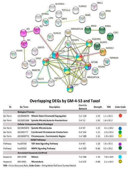 Functional analysis of the 52 transcripts overlaps in DEGs by paclitaxel and GM-4-53 vs. controls. The data represent significant functional changes as identified by several databases: local network cluster (STRING), Kegg pathways, Reactome Pathways expected protein domains and feature (Interpore), where data are reflected by count in network, strength, and false discovery rates.