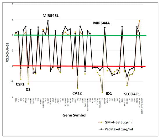 Overlapping DEG profiles between GM-4-53 and paclitaxel. The data represent fold change for genes meeting the selection criteria = FC > 2 or < −2, p-value < 0.05, and FDR p-value < 0.05.