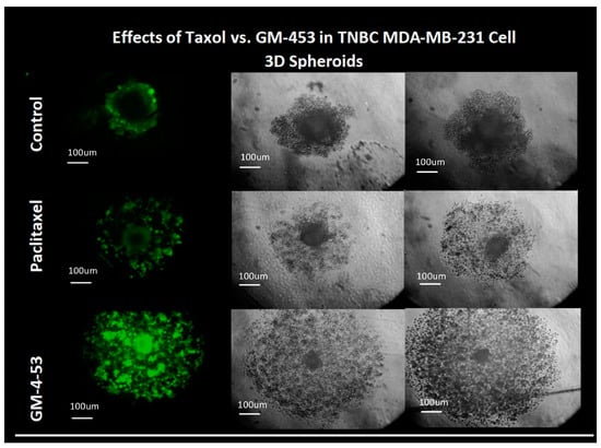 While these are just a few promising aspects of GM-4-53, future work will be required to elucidate both the therapeutic and limiting factors of this drug. The data from this work clearly define the following: this drug is a cytostatic, non-cytotoxic agent with a similar effect on TNBC to the mainline drug, paclitaxel. The lack of cytotoxicity by paclitaxel has been observed in ex vivo explants of human breast tumors, which penetrate a tumor and disrupt mitosis without directly invoking cytotoxicity []. There is a clear distinction between cytotoxic drugs vs. cytostatic drugs, demarcated by the extremely large difference in drug dose concentrations between lower-dose effective blocks on cell proliferation (IG50) vs. cell viability ratios (IC50), where dead cells do not divide. While the data in this work also show that both drugs affect established 3D spheroid tumors, GM-453 appears to have significant effects on the clustering of cells or penetration of the tumor spheroid, which could theoretically either prevent tumor formation and/or alter the metastatic proclivity of circulating tumor cells [].