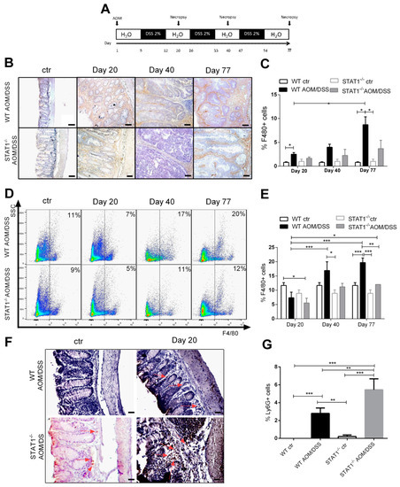 Macrophage populations are reduced in STAT1-/- AOM/DSS-treated mice: (A) schematic time schedule of azoxymethane (AOM) and dextran sodium sulfate (DSS) administration. After the initial AOM injection (12.5 mg/kg), DSS was given in drinking water for 7 days followed by 14 days of regular drinking water. Mice were sacrificed on days 20, 40 (early tumor development), and 77 (late tumor development) post-AOM injection; (B) representative microscopic images showing immunohistochemical staining of F4/80 macrophages in colon tumor sections from WT and STAT1-/- mice treated with AOM/DSS at different times of tumor progression Scale bars: 50 µm; (C) percentage of cells stained positive for F4/80; (D) representative dot plots showing CD11b+F4/80+ cell populations in spleens of WT and STAT1-/- mice treated with AOM/DSS at the indicated time intervals; (E) percentages of CD11b+ F4/80+ cells in the splenocytes of WT and STAT1-/- mice treated with AOM/DSS at different times of tumor progression; (F) immunohistochemical staining and (G) percentage of Ly6G+ cells in colon tissues in day 20. The quantification of Ly6G+ cells was performed using ImageJ software v.1.48 by counting cells in 10 high-powered fields from at least three slides per animal. Scale bars: 50 µm.The red arrowheads indicate Ly6G localization. Data shown are the mean ± SE of four or five individual mice per group per day of analysis and are representative of three individual experiments with similar results per day of the analysis. * p < 0.05, ** p < 0.01, *** p < 0.001.
