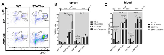 MDSCs are characterized by potent immunosuppressive activity and the ability to promote tumor angiogenesis, tumor cell invasion, and metastases [18]. Additionally, MDSCs can contribute to tumor development associated with inflammation [19]. We asked what role, if any, these cells may have in tumor development associated with STAT1 deficiency. Our analysis revealed a significant increase in the accumulation of CD11b+ Ly6ClowLy6G+ cell populations in the spleen and blood of tumor-bearing STAT1-/- mice, compared with WT mice at the very early stages of tumor transformation (Figure 2A–C). In the spleens of STAT1-/- AOM/DSS animals, CD11b+ Ly6ClowLy6G+ cells were two times more prevalent, compared with WT AOM/DSS mice at day 20 (p < 0.05, Figure 2A,B). As CAC progressed, the accumulation of granulocytic cells decreased in the spleens of STAT1-/- AOM/DSS animals, with no differences between tumor-bearing STAT1-/- and WT mice at day 77 (Figure 2B). Similar trends were found in the blood of STAT1-/- AOM/DSS animals at day 20, although to a lesser extent (Figure 2C). At day 77, increases in the CD11b+Ly6ClowLy6G+ cell populations were observed in the blood of both WT and STAT1-/- AOM/DSS mice, with no differences between groups (Figure 2C).