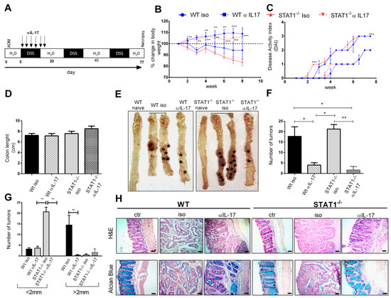 Therapeutic efficacy of IL-17 neutralization in STAT1-/- mice during CAC: (A) WT or STAT1−/− mice were injected with isotype control or anti-IL-17 neutralizing antibody from day 7 to 19 every other day (black arrows) after AOM/DSS administration. On day 77, the animals were euthanized to analyze tumor development; (B) weight changes in WT and STAT1-/- mice with isotype and anti-IL17-treated mice. The mean weight of mice on day 0 of treatment was taken as 100% and was compared with the weekly weight until the end of the experiment; (C) the disease activity index (DAI) score was assessed on the indicated days for each animal and averaged per day for each group; (D) colon length, (E) macroscopic images of the colon (asterisks are pointing to the tumors), (F) number and (G) size of tumors 77 days after AOM injection; (H) colon sections stained with H&E as well as with Alcian blue to visualize goblet cells. Scale bars: 50 µm. Data shown are the mean ± SEM of at least four or five mice per group and are representative of two individual experiments with similar results per day of the analysis. * p < 0.05, ** p < 0.01, *** p < 0.001.