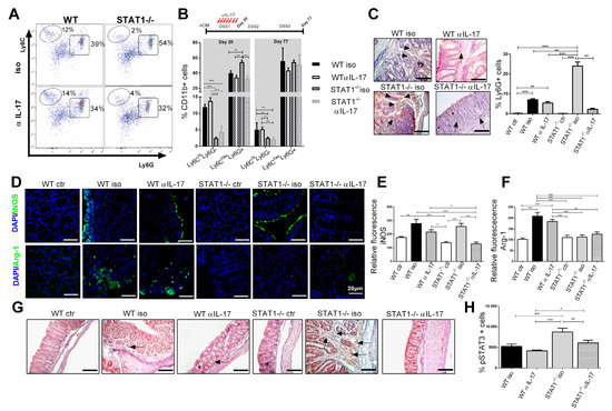 Next, we analyzed the impact of IL-17 neutralization on immune cell populations. In the early (day 20) and late (day 77) stages of tumor development, the accumulation of CD11b+Ly6ChiLy6G- monocytic cells among CD11b+ cells were increased in WT mice treated or not with anti-IL-17 blocking antibody, compared with STAT1-/- mice (p < 0.001, Figure 4A,B). On the contrary, the monocytic fraction was unaffected in iso and anti-IL-17 STAT1-/- mice. The presence of CD11b+Ly6ClowLy6G+ granulocytic cells at day 20 was significantly reduced in STAT1-/- mice following IL-17 blockade, compared with the STAT1-/- mice that received the isotype antibody (p < 0.01, Figure 4A,B). However, no differences were observed at day 77 in this cell fraction between STAT1-/- mice upon IL-17 neutralization (Figure 4B). Furthermore, we investigated whether blocking IL-17 affected neutrophil recruitment in the intestine. As expected, the infiltration of neutrophils in STAT1-/- mice treated with anti-IL-17 blocking antibodies was reduced, compared with WT mice that received the same treatment (Figure 4C). One of the main characteristics of MDSCs in cancer is L-arginine depletion, which inhibits T-cell proliferation. Arginase-1 and iNOS activity promote tumor growth that escapes from immune surveillance through the depletion of L-arginine [26]; thus, we analyzed the levels of iNOS and Arginase-1 (Arg-1) expression in the intestine as a result of the activation of MDSCs in a pathological context. As shown in Figure 4D, WT iso mice presented an enhanced accumulation of Arg-1- and iNOS-positive cells in the colon, compared to naïve mice. However, Arg-1 expression was significantly reduced in the colon of STAT1-/- iso animals, compared with WT (p < 0.01, Figure 1D,F). The administration of anti-IL-17 antibodies did not affect the expression of iNOS and Arg-1 in WT mice (Figure 4D–F). However, during the state of STAT1 deficiency, IL-17 neutralization resulted in a slightly reduced expression of iNOS, compared with STAT1-/- mice that received isotype antibodies (Figure 4D,E).