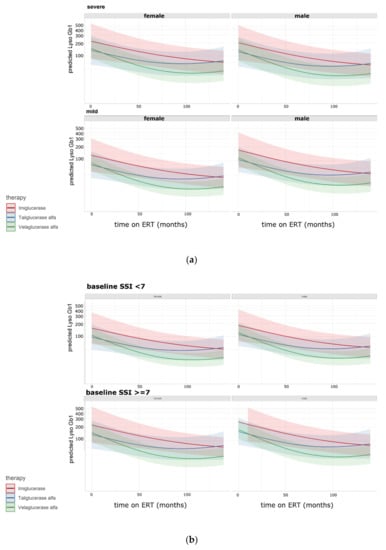 The first part of the analysis was a comparison of baseline lyso-Gb1 levels between patients’ groups based on their demographic (sex and age), their treatment (ERT type, dose and duration), and their disease severity; the second set of statistical analyses was a comparison between the lyso-Gb1 values and overtime of a specific ERT product, adjusted for sex, disease severity and dosage. The association between the duration of therapy and lyso-Gb1 (higher levels among those patients treated for a shorter period) is self-explanatory, as the clearance of the storage glycolipids takes time (for example, in a post hoc analysis of the reduction in lyso-Gb1 in three clinical trials with velaglucerase-alfa, the mean percent reduction from baseline was 41% in 6 months, 64% at 12 months and 75% at 24 months [25]). Age at first time point observation was positively associated with lyso-Gb1 levels; in GD, as in many other lysosomal storage diseases and inherited metabolic disorders in general, the younger the age at presentation (the onset of symptoms), the more severe the phenotype is [1]. Additionally, younger patients had shorter times on ERT and, therefore, higher levels of lyso-Gb1.