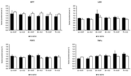 Cell viability of HGF-1 cells growing on different specimen disks at day 1 and day 21. Factors correlated to the control (set as 1) were shown. Proliferation rate was described by an MTT assay (p = 0.009); cytotoxicity was described by the release of LDH to culturing media (p = 0.009); grade of differentiation potential was described by the expression of FGF2 (significant for Li—0.2, p = 0.009, and Ti—0.07, p = 0.44); possible inflammation reaction was described by the expression of TNFα (p = 0.009–0.014).