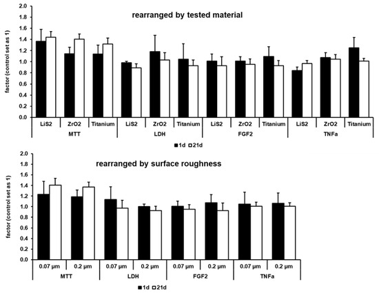 Considering surface roughness and used material, results were rearranged, and the summarized results are shown in Figure 2. Concerning material, changes between day 1 and day 21 were significant, with a p-value of 0.017 for MTT and with a p-value of at least 0.009 for LDH release. For FGF2 expression, observed changes were only significant in the titanium group, with a p-value of 0.036. For TNFα expression, observed changes were significant in the LiS2 group and titanium group, with a p-value of 0.009, and not in the ZrO2 group. Concerning roughness, changes between day 1 and day 21 were significant, with a p-value of 0.009 for MTT, for LDH release, and for TNFα expression. Observed differences for FGF2 expression were only significant in the 0.2 µm group, with a p-value of 0.009.